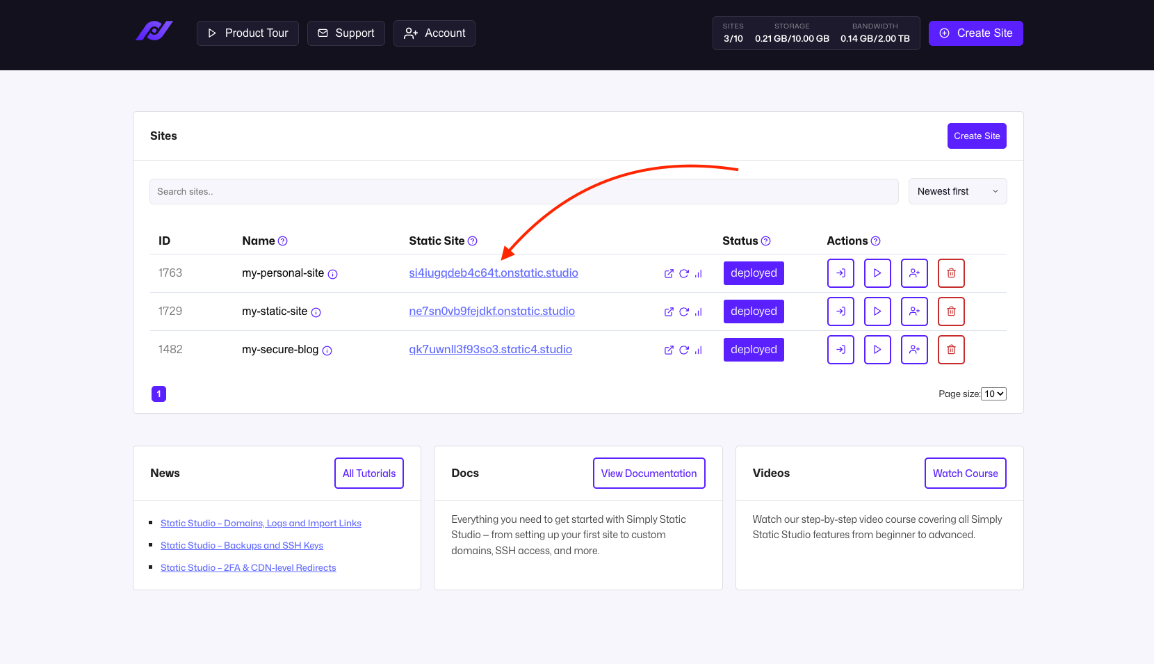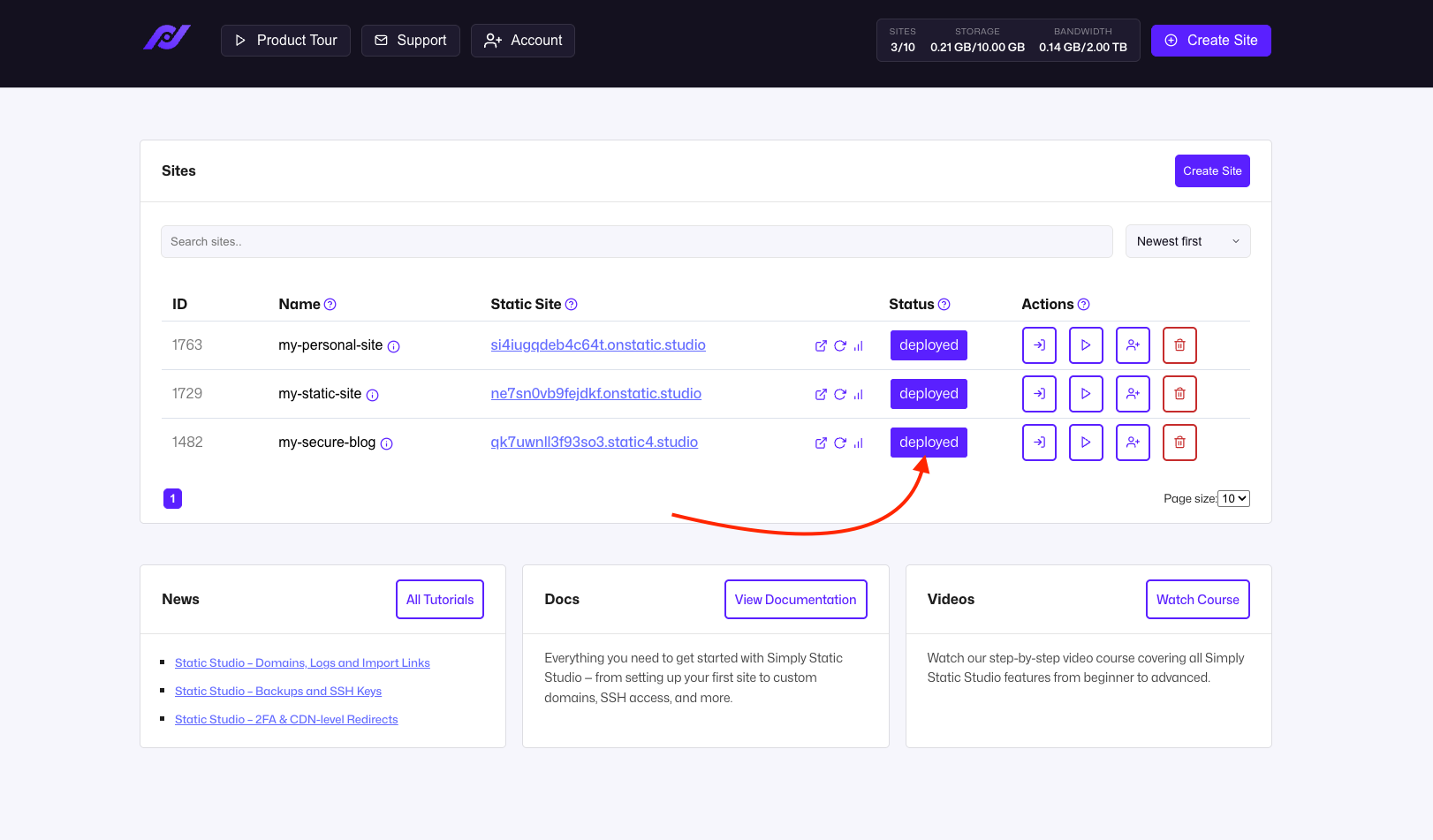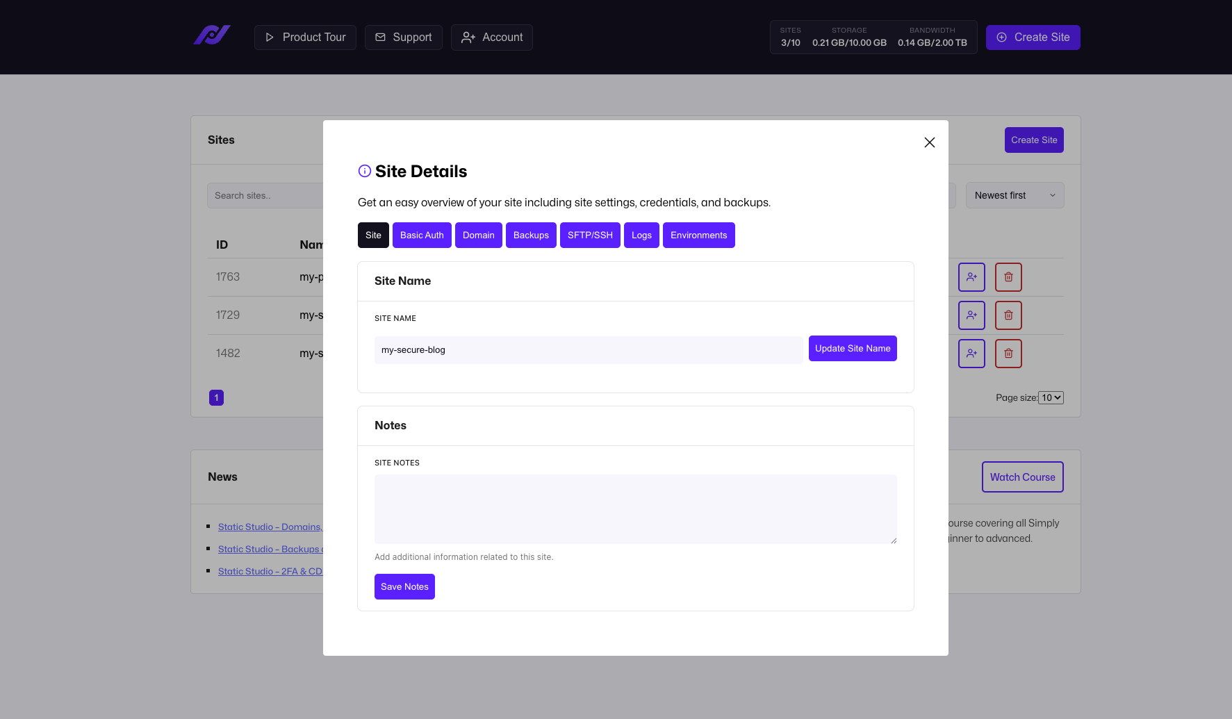 By clicking on the name, you will get to your site details, where you can control various things related to your site: