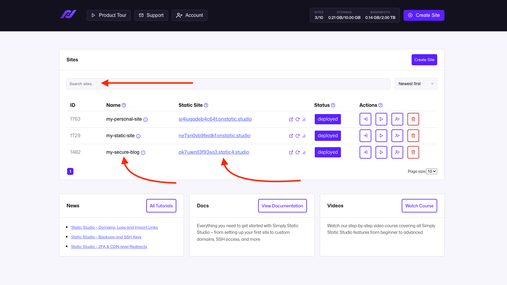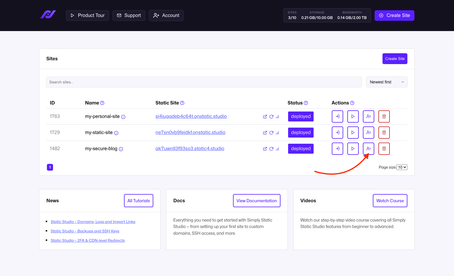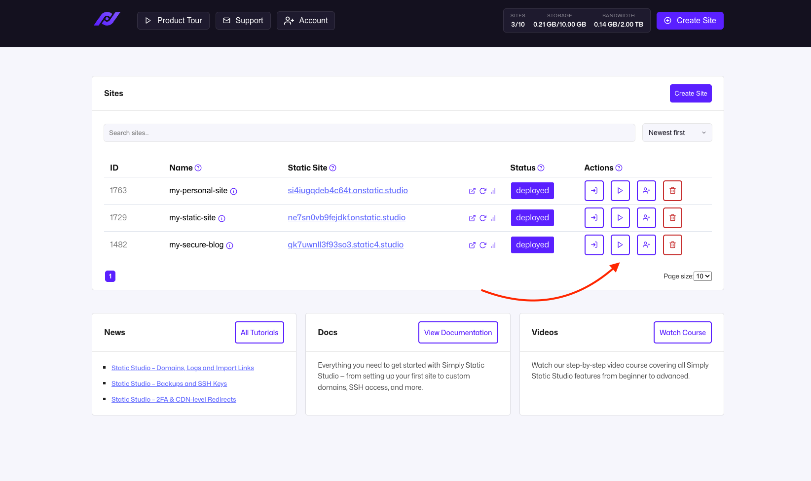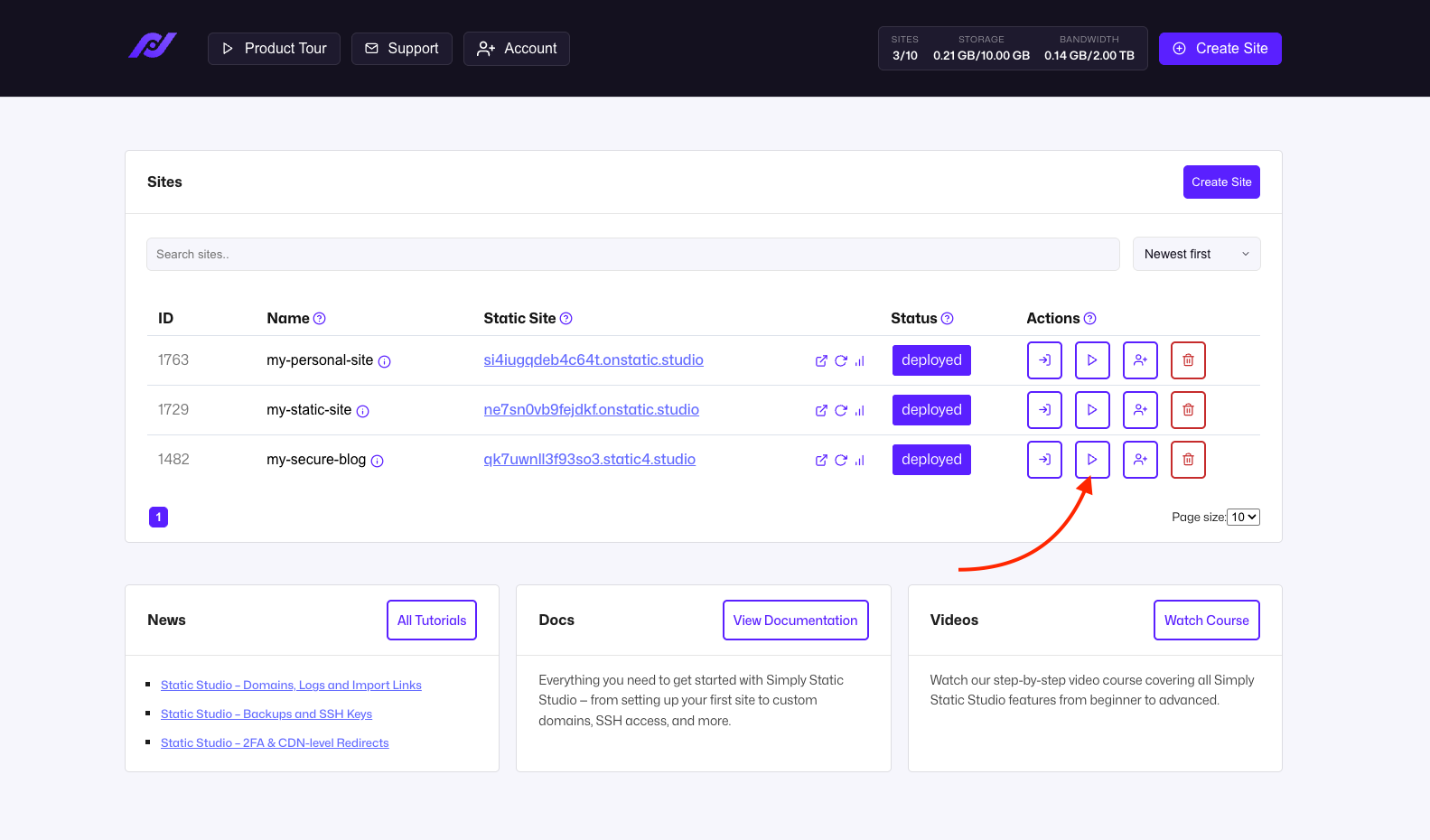 By clicking on the name, you will get to your site details, where you can control various things related to your site:
