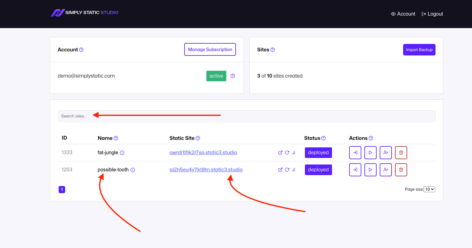 The search lets you find sites by name or URL. It's a live search and also works for paginated pages, so don't worry, we'll find the site you're looking for.