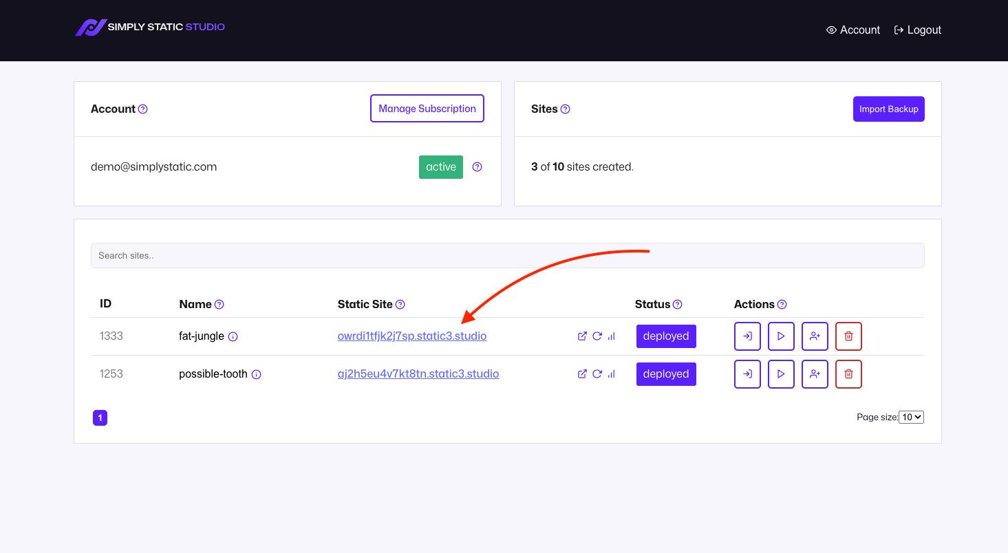 There are also three icons next to the URL - all those actions are directly related to the static site: