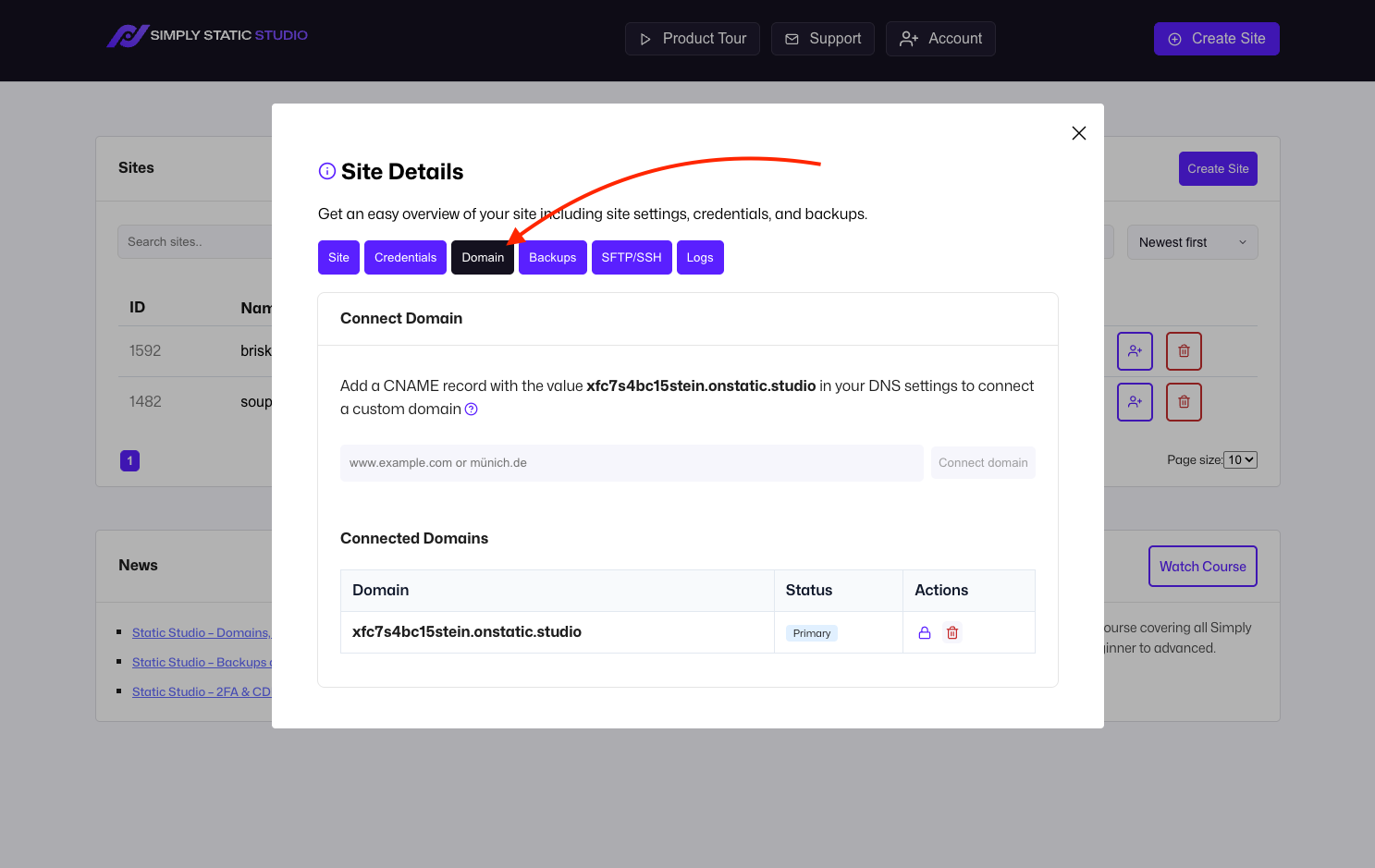 Connecting a domain involves two steps. First, you copy the CNAME record (xfc7s4bc15stein.onstatic.studio in this example) and add it to your DNS settings.