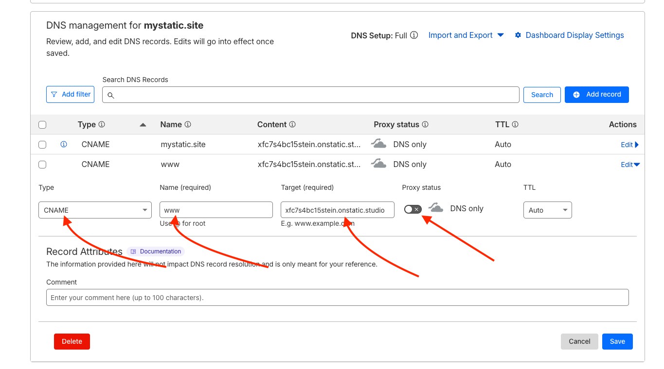 - Proxy Status: disabled (only relevant for Cloudflare)