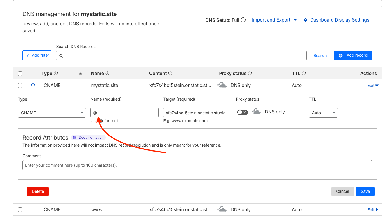 Here is what an example configuration for adding an APEX CNAME record will look like: