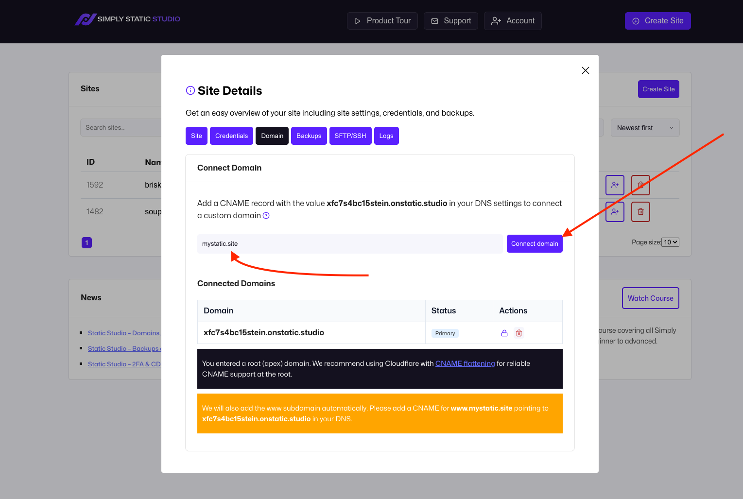 A quick note: We ONLY connect the custom domain to your static site. Your protected WordPress installation will still be served from the onstatic.studio subdomain.
