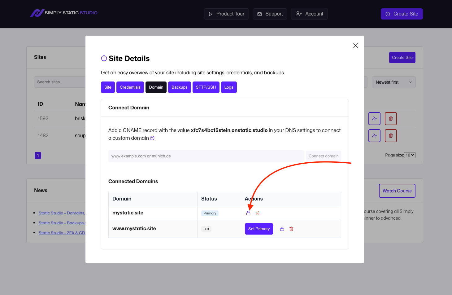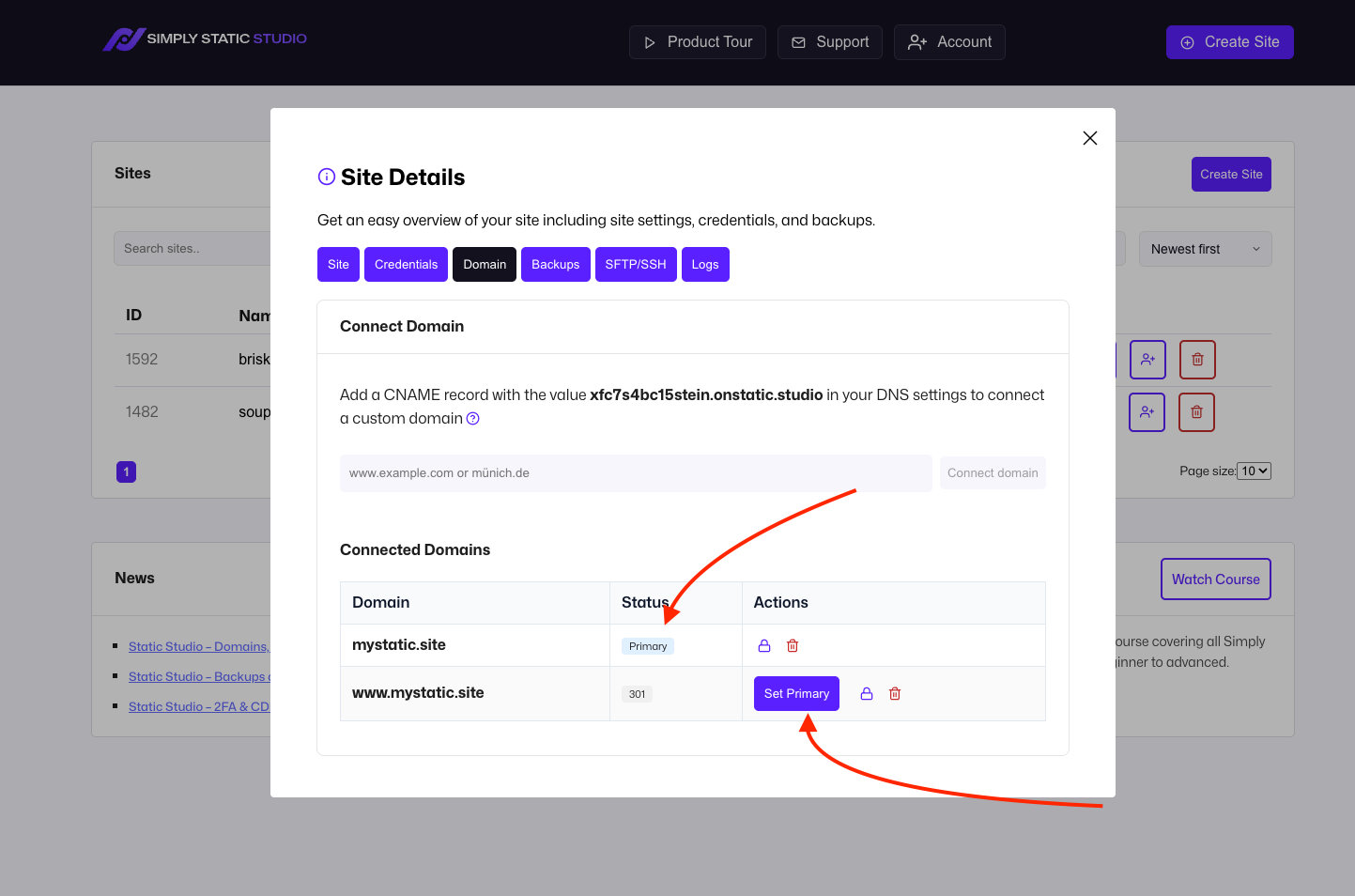 We automatically set the domain you added as the primary; however, if you want to switch that, simply click the Set Primary button next to the domain you want to use, and we switch it for you.