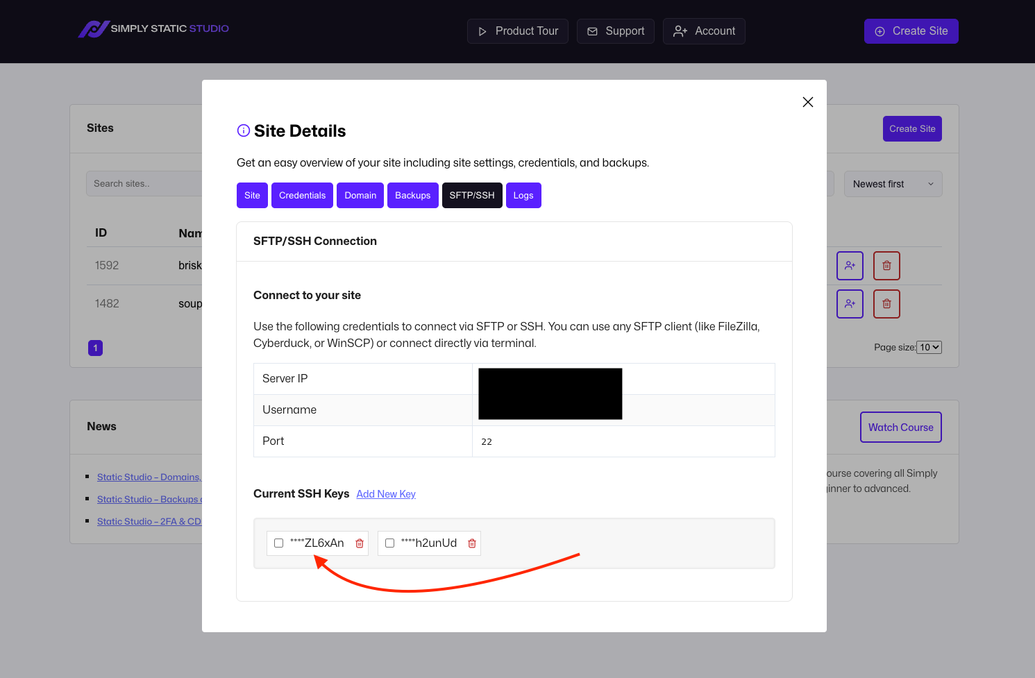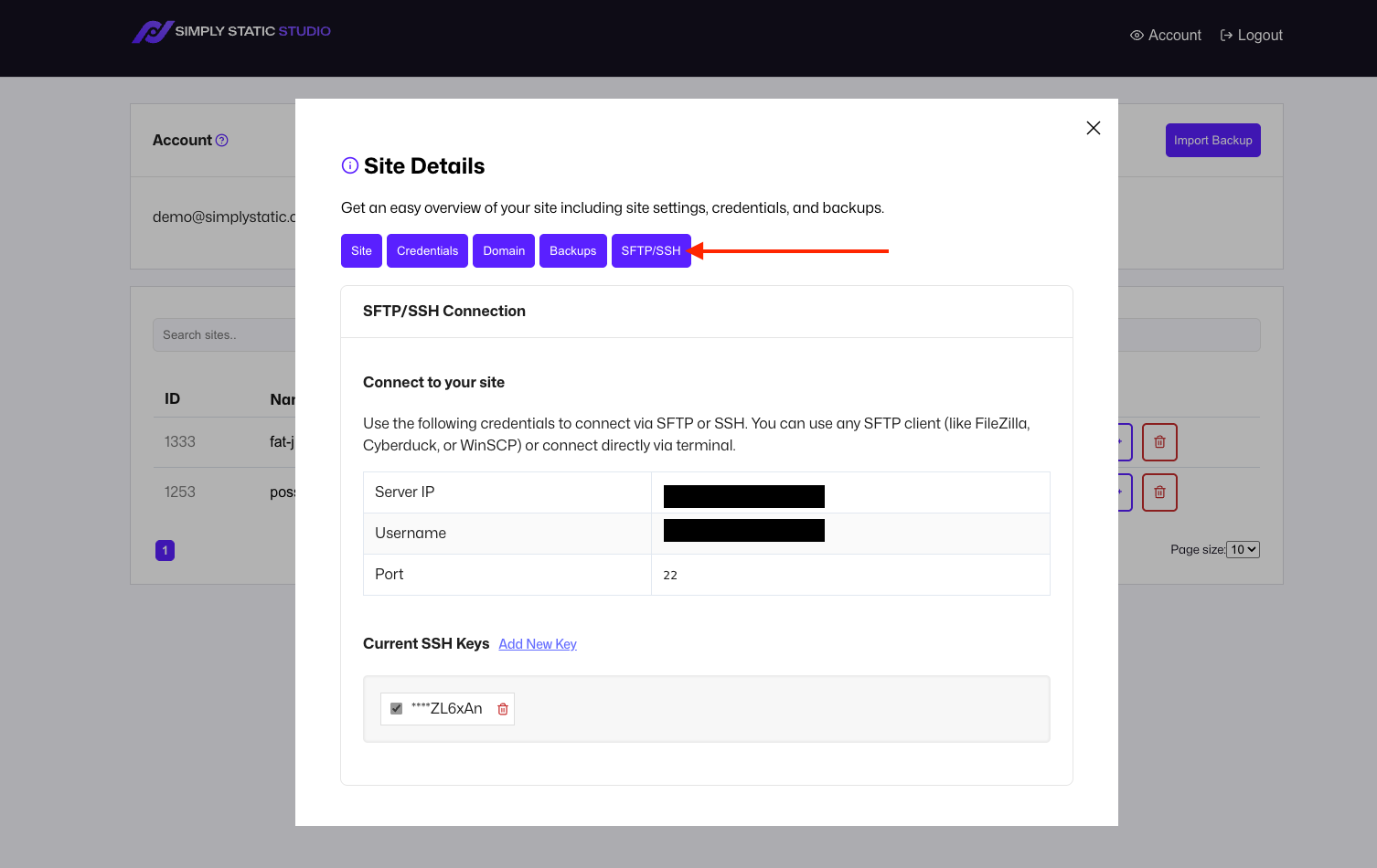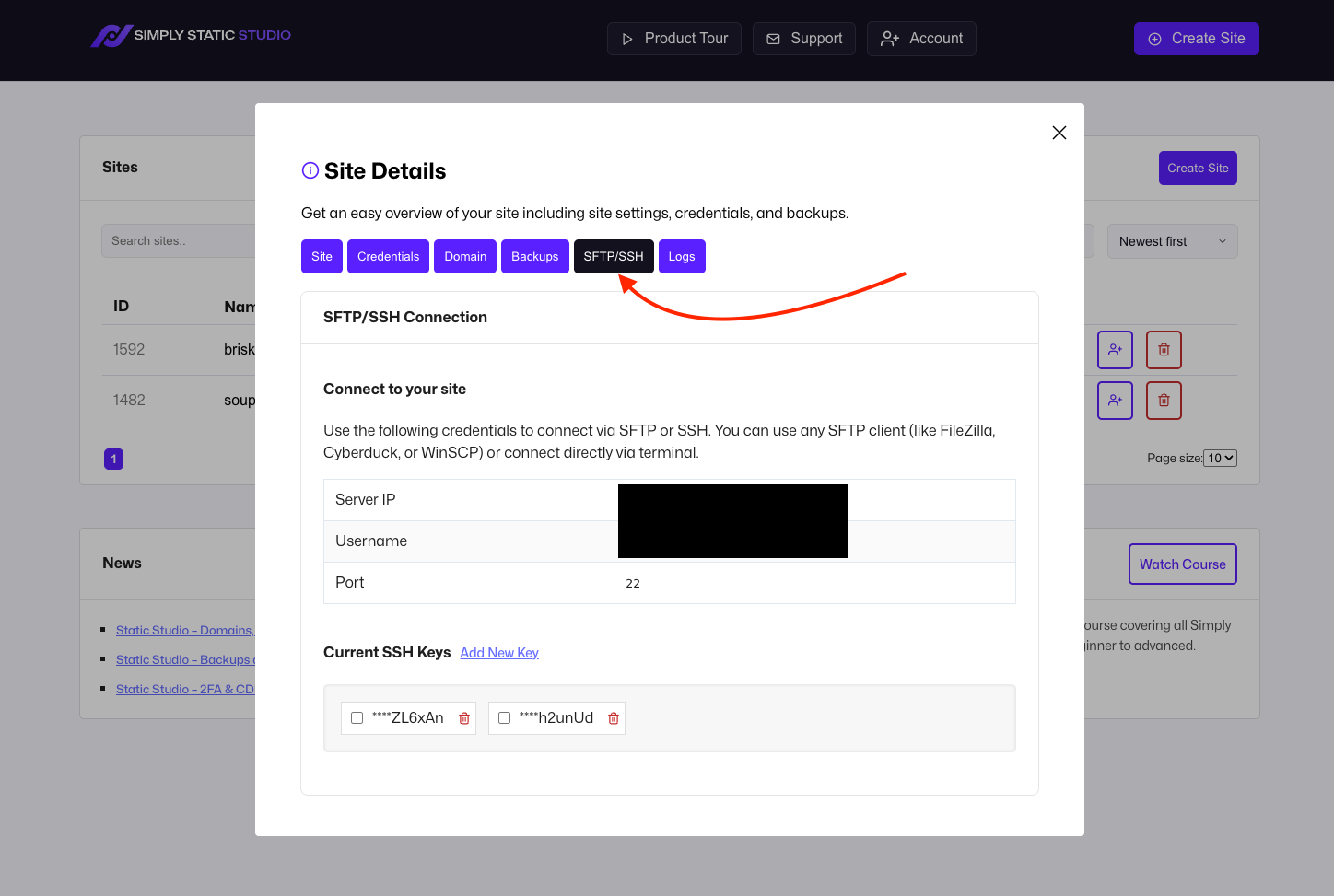 You can manage your SFTP and SSH connections within the Site Details - click on the name of your site and switch to the SFTP/SSH tab: