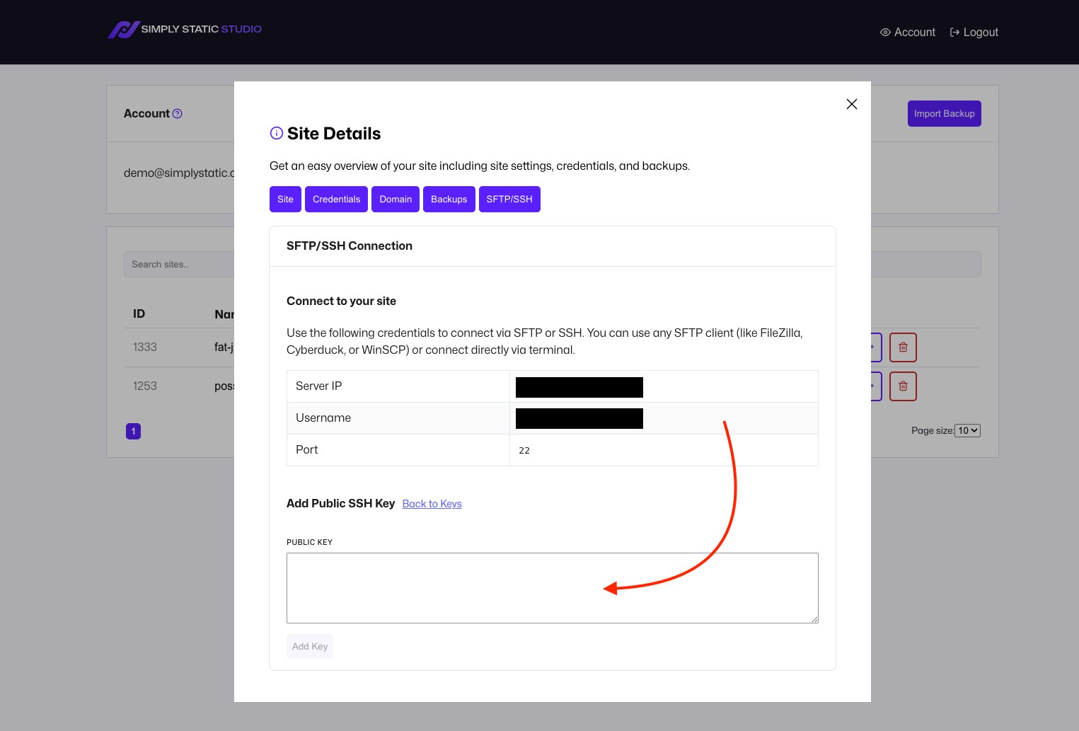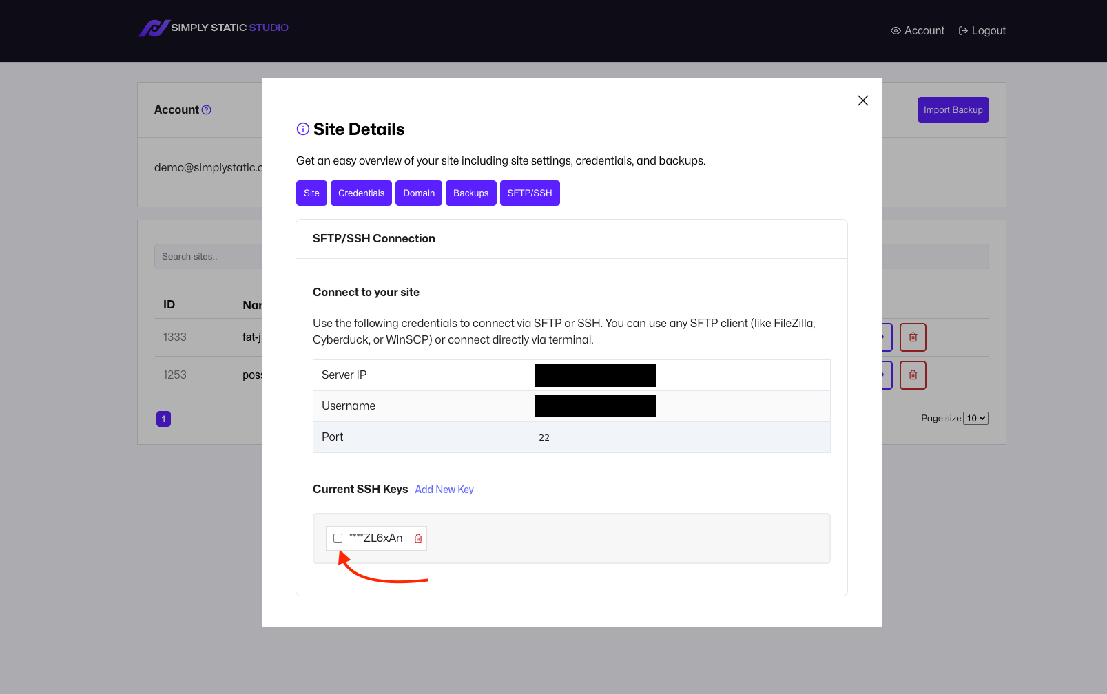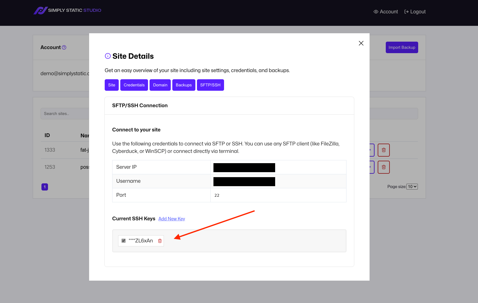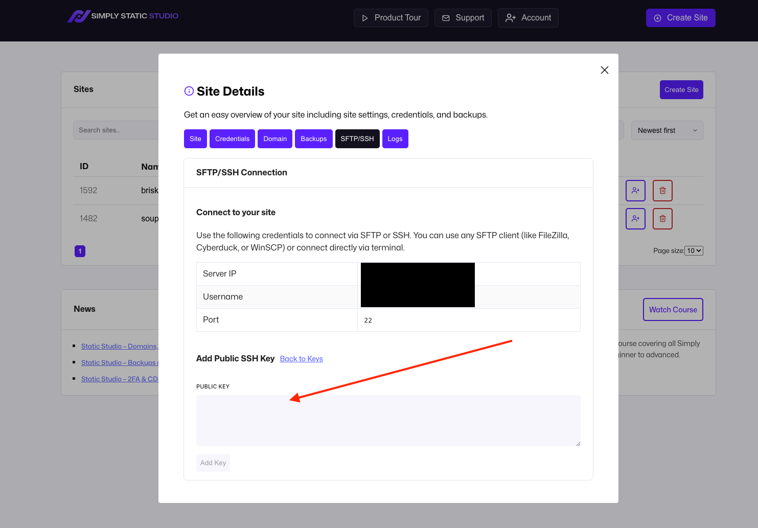 You can manage your SFTP and SSH connections within the Site Details - click on the name of your site and switch to the SFTP/SSH tab: