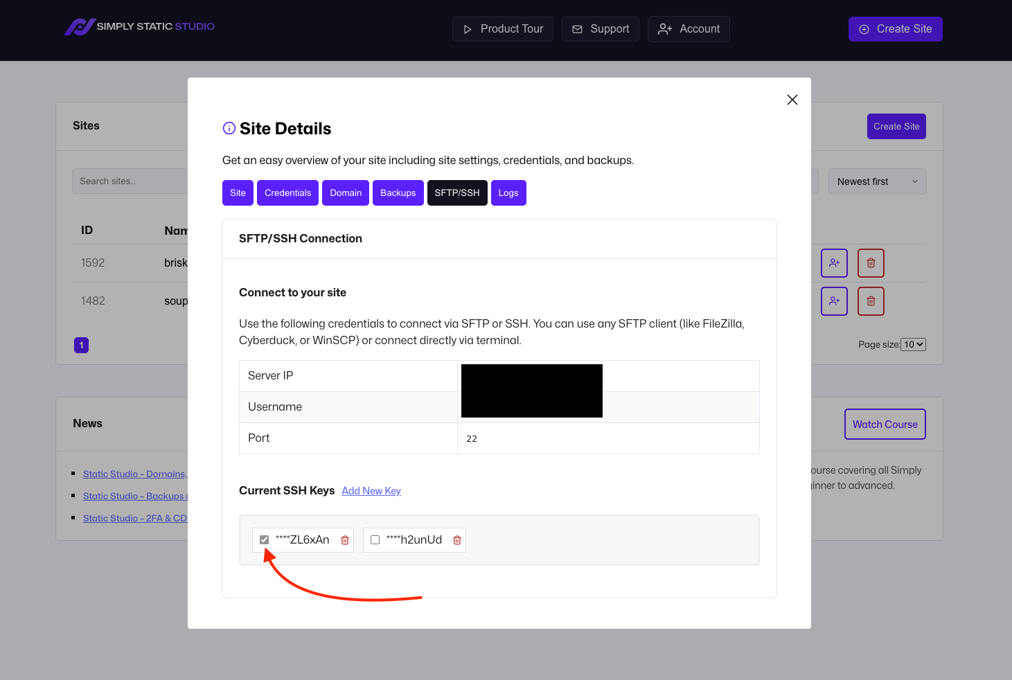 Notice the little checkbox next to the key? Click it to finally grant access to your site for the given SSH key.