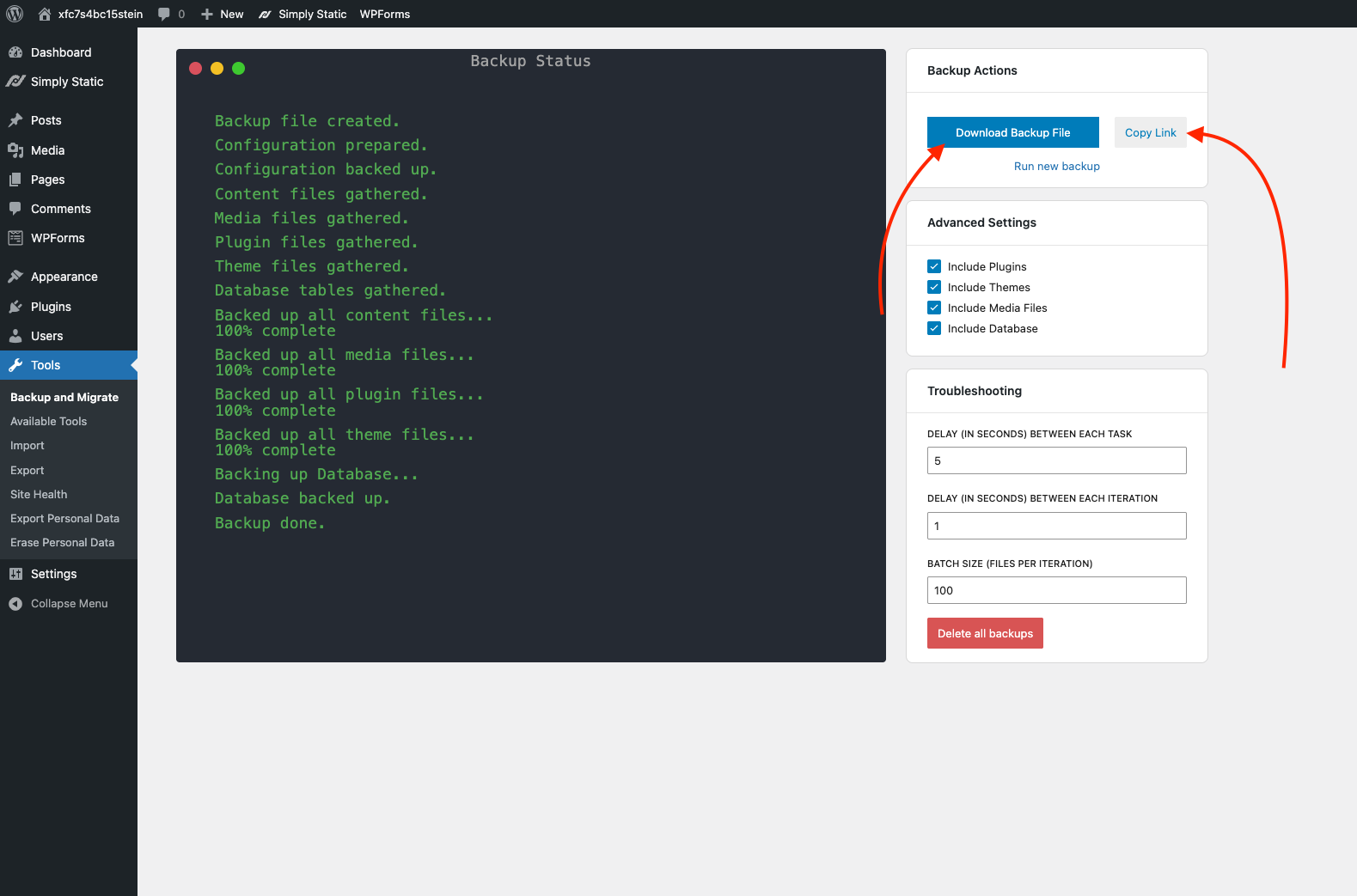 Once the backup process has finished, you can download the backup or copy the link from the top right: