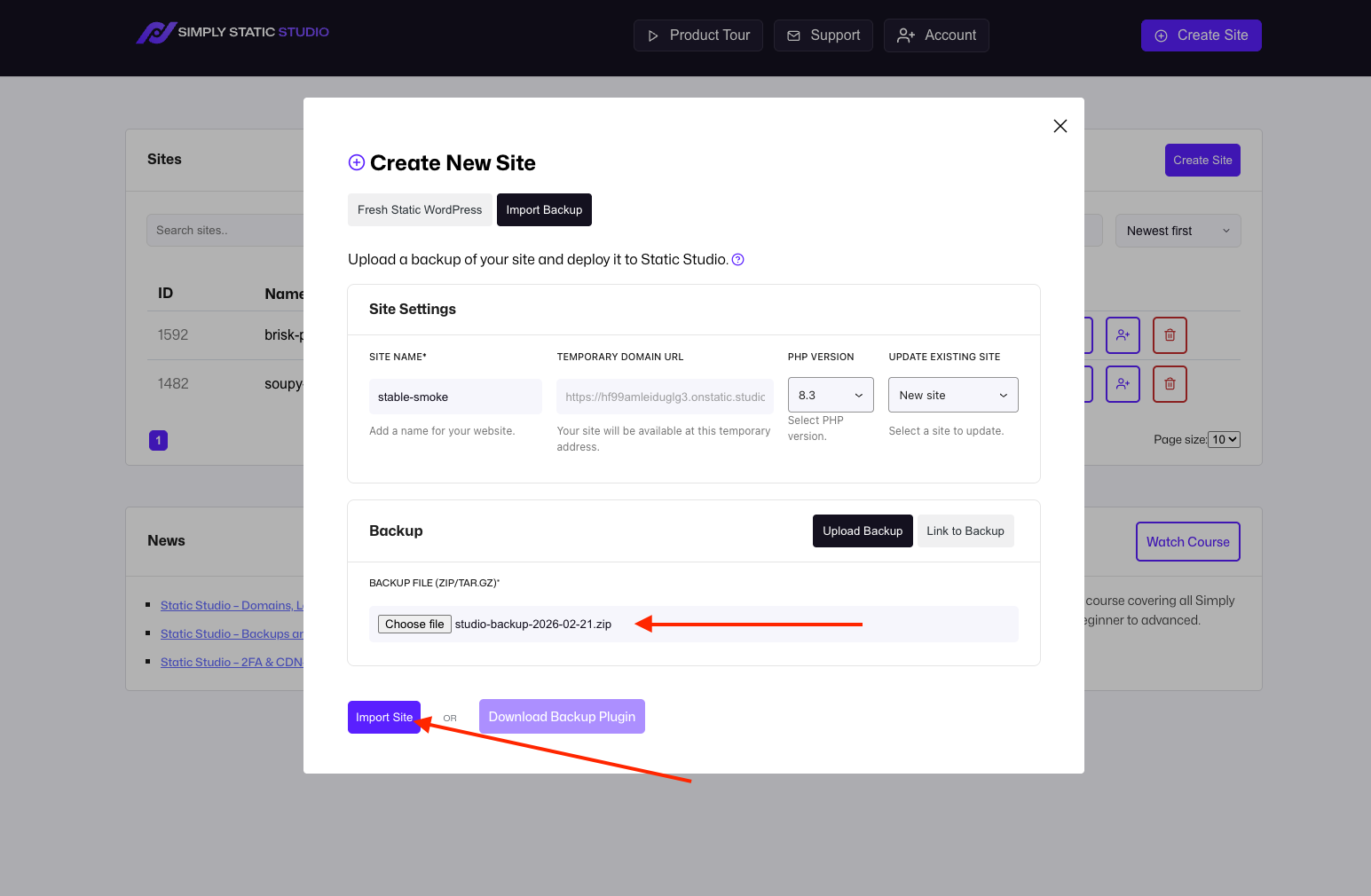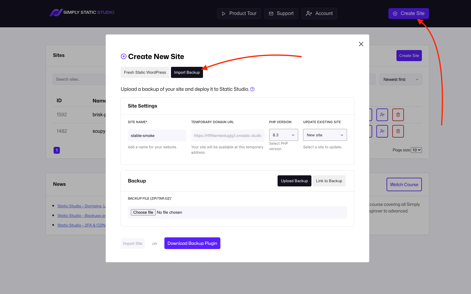 Click Create Site, then switch to Import Backup. You can customize the site name, PHP version or choose an existing site from your account to overwrite it with the backup: