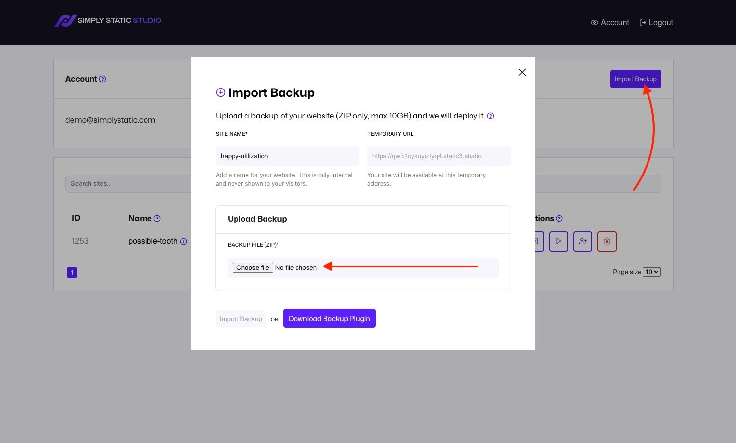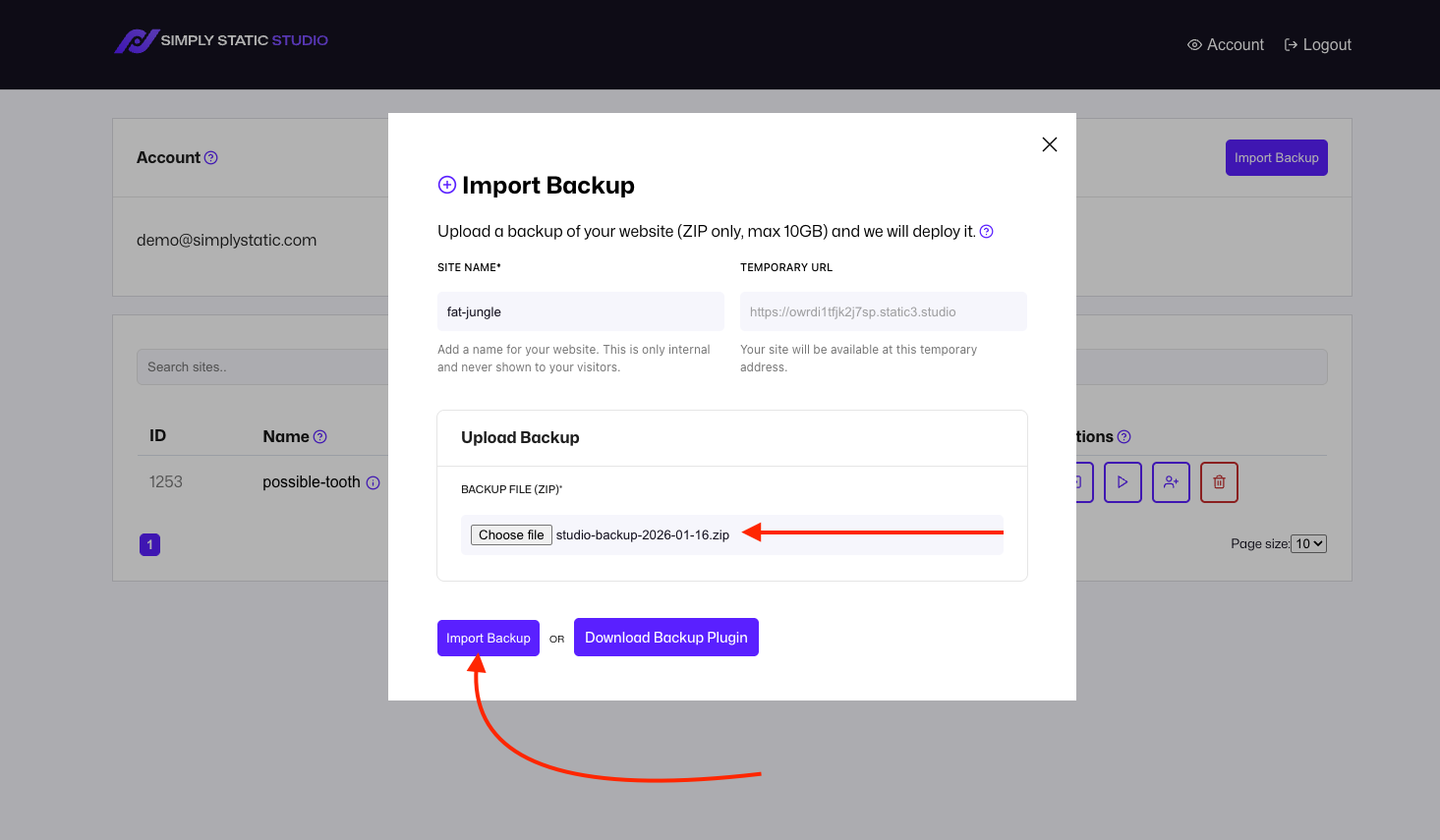 Now that you have your backup, log into your static.studio dashboard, click Import Backup, and select the backup file you've created: