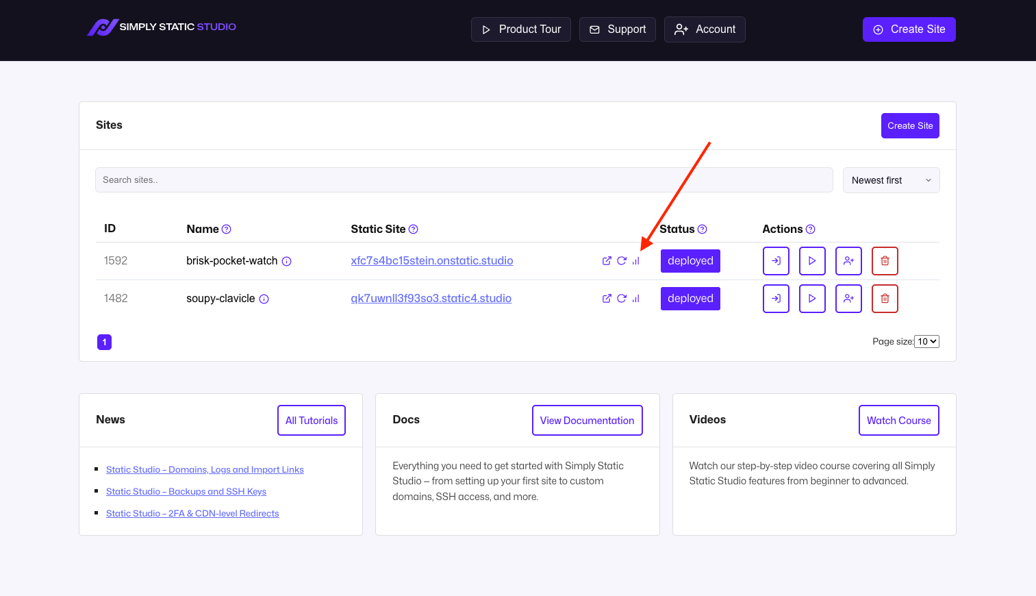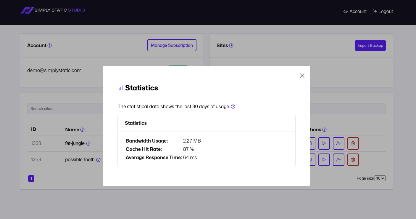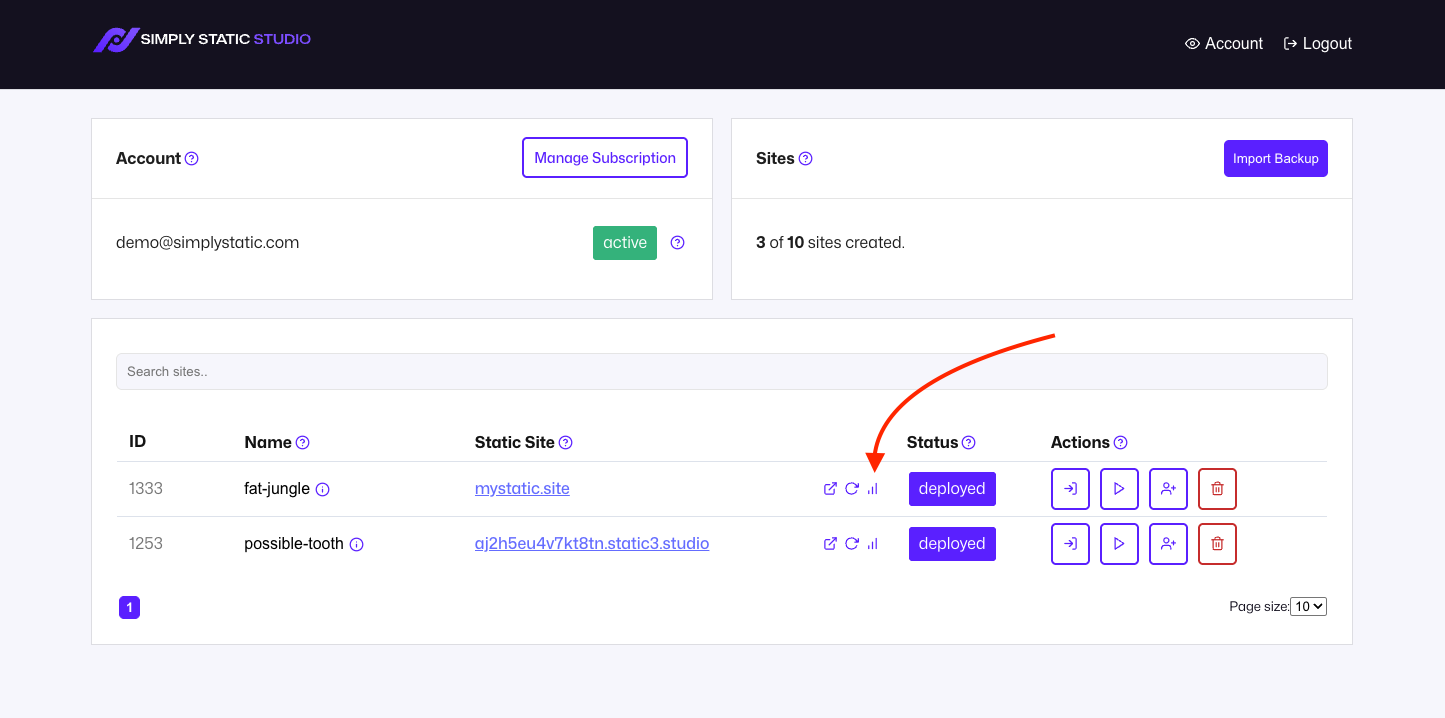 You can get insights into the monthly usage statistics of your static site by clicking on the icon next to the URL of your static site: