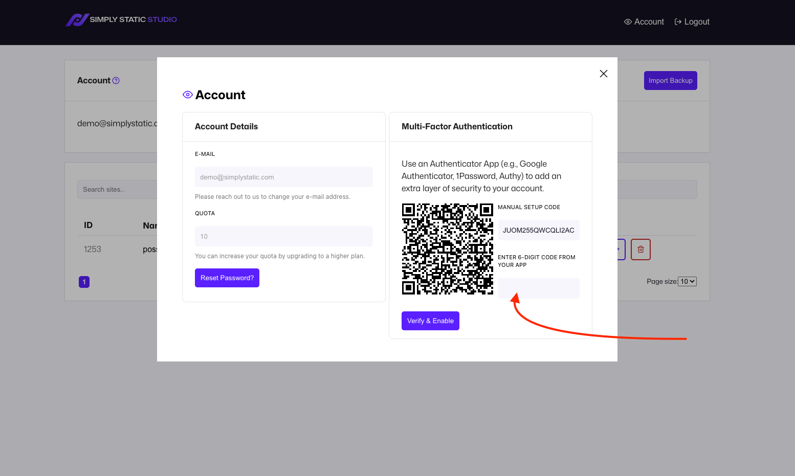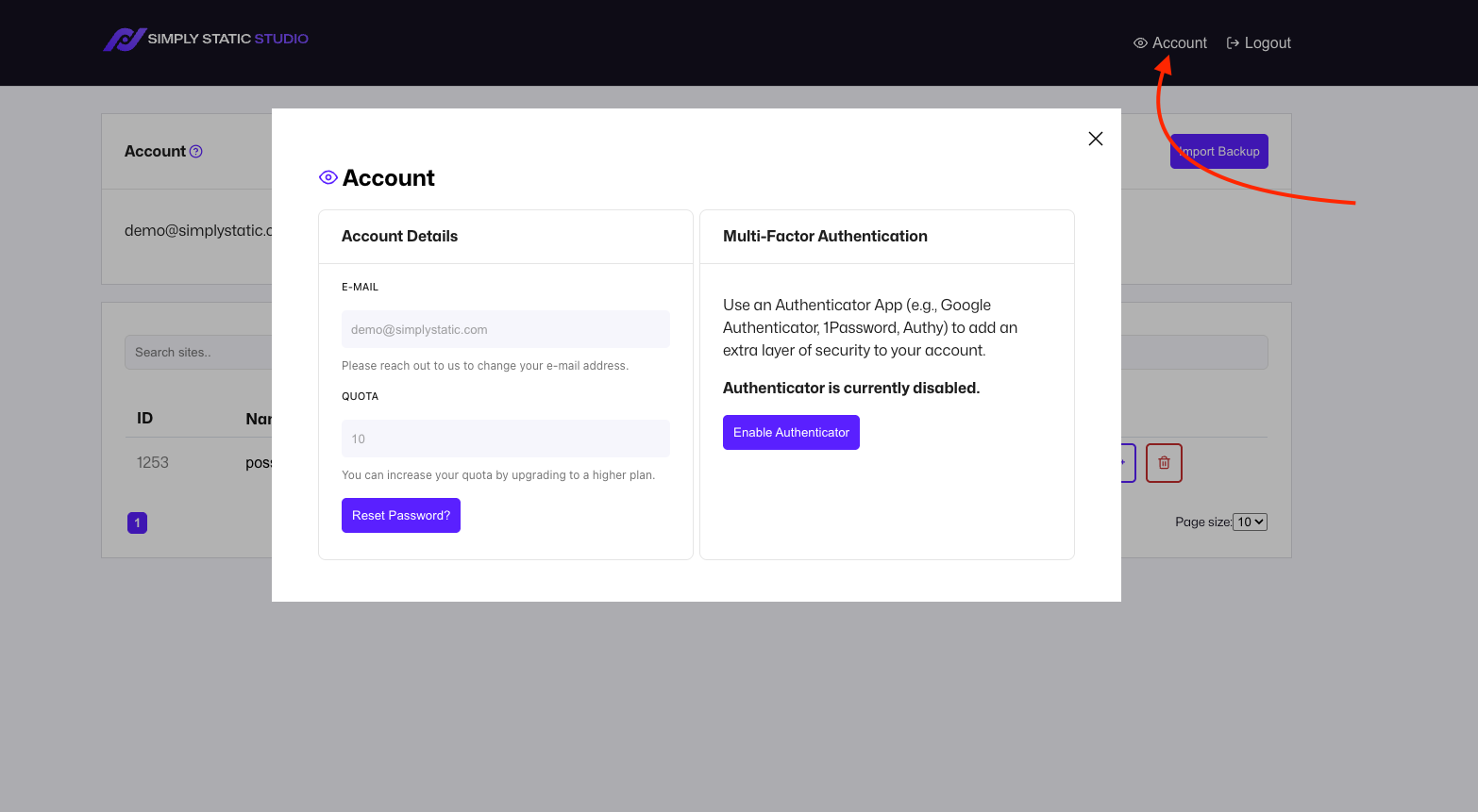 In your dashboard, click "Account," then "Enable Authenticator."